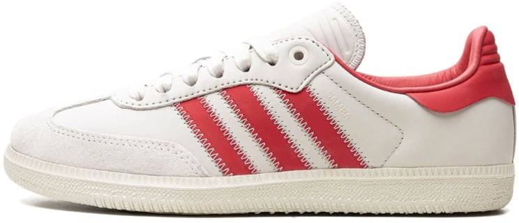 De Samba Humanrace Core Black presenteert een strak, tijdloos design met klassieke lijnen en retro-invloeden, uitgevoerd in een overwegend witte look met contrasterende donkergrijze details. Een gestileerde hielkap en iconische drie strepen in donkergrijs zorgen voor een sportieve flair, terwijl gladde en suède oppervlakken samen een dynamisch contrast vormen. De licht afgeronde neus en een tong met subtiele textuur en verhoogd logo benadrukken het verfijnde vakmanschap. Deze heren sneaker uit de new luxury-lijn combineert elegantie met herkenbare Adidas-signatuur.
