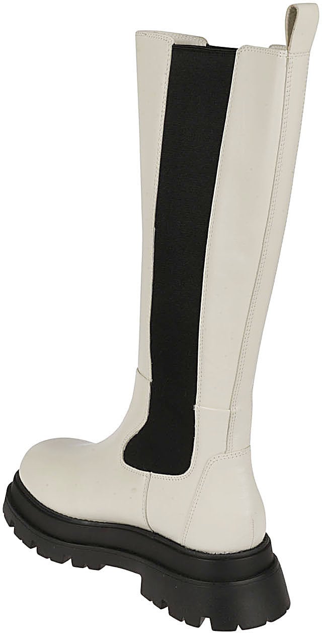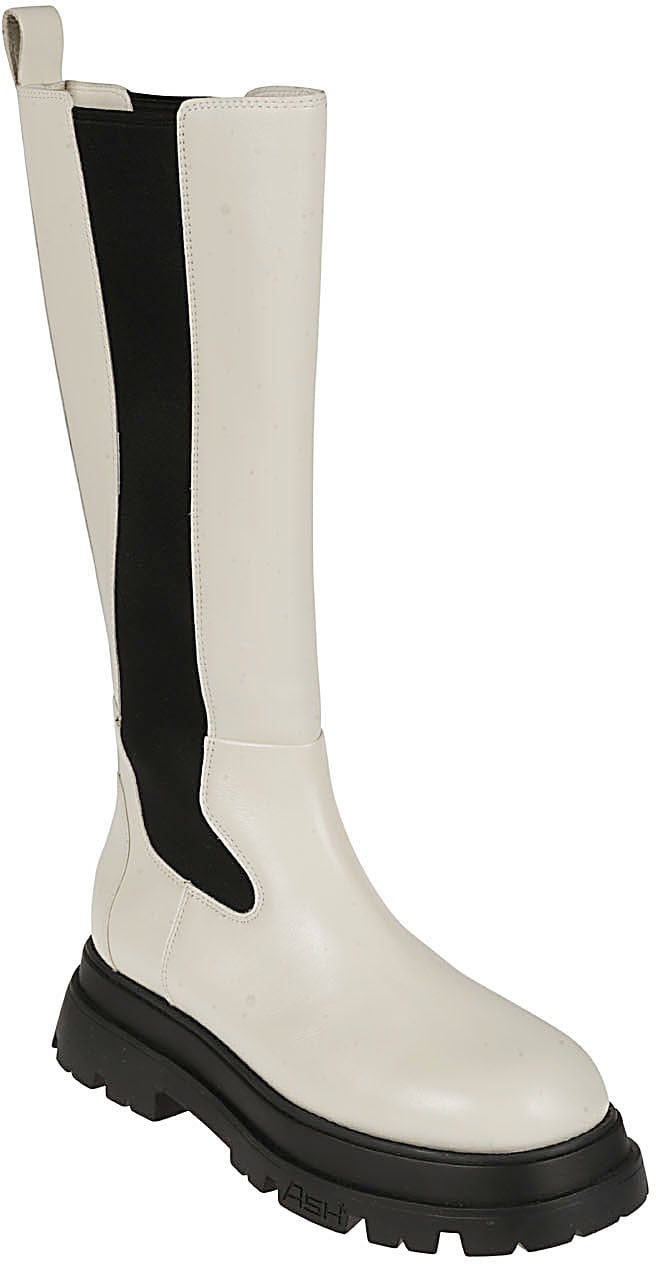 De Boots White van Ash zijn dameslaarzen die zich kenmerken door een moderne esthetiek en opvallende kleurcontrastering. De bovenkant is uitgevoerd in een frisse, crèmekleurige tint, terwijl de zijkanten zijn afgewerkt met diepzwart elastisch paneel, wat zorgt voor een dynamisch visueel effect. De stevige, robuuste zool biedt zowel stijl als functionaliteit met een uitgesproken profiel. De hoge schacht en minimalistische lijnen dragen bij aan de eigentijdse uitstraling van deze laarzen, waardoor ze een elegante aanvulling zijn op elke herfst- of winteroutfit.