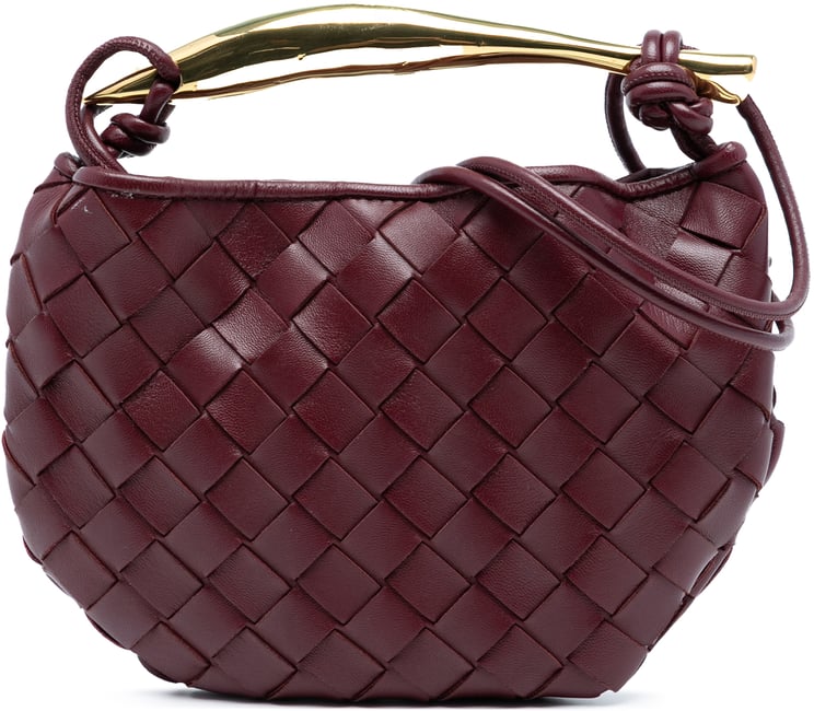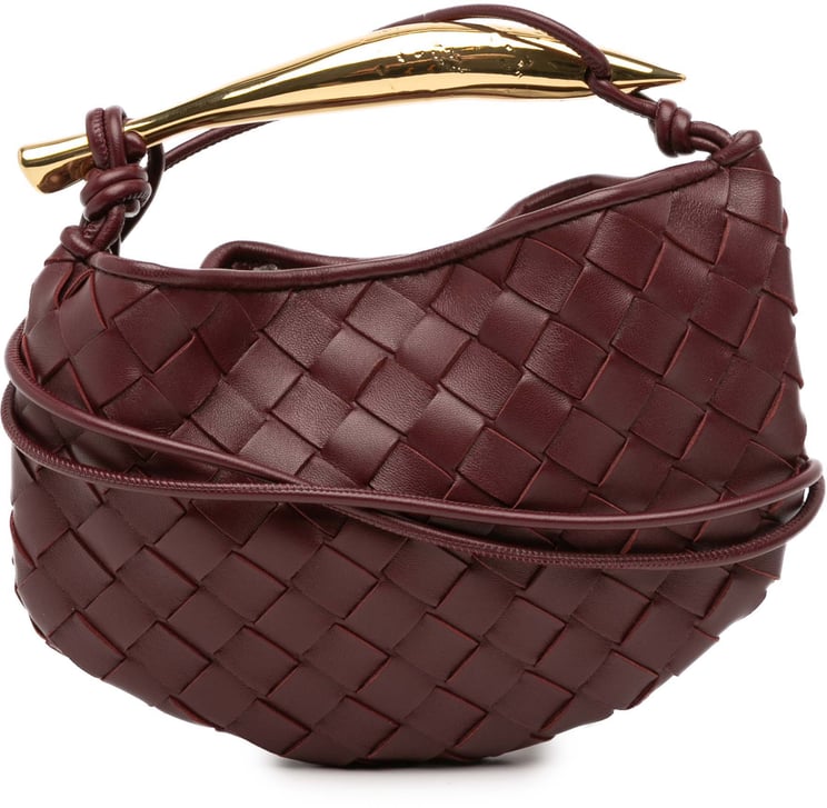 Een compact model met het kenmerkende intrecciato-vlechtwerk van Bottega Veneta in rood, uitgevoerd in zacht lamsleer met een open bovenkant en magnetische sluiting voor gemakkelijke toegang. Het ontwerp heeft een sculpturale, afgeronde vorm en een goudkleurige metalen handgreep als opvallend accent, aangevuld met opgerolde leren draagbanden voor variabele draagopties. Afmetingen: 21,00 x 15,00 x 1,50 cm; vervaardigd in Italië en geproduceerd tussen 2012–2025. Materiaal: baby lamsleder. Conditierating: AB.