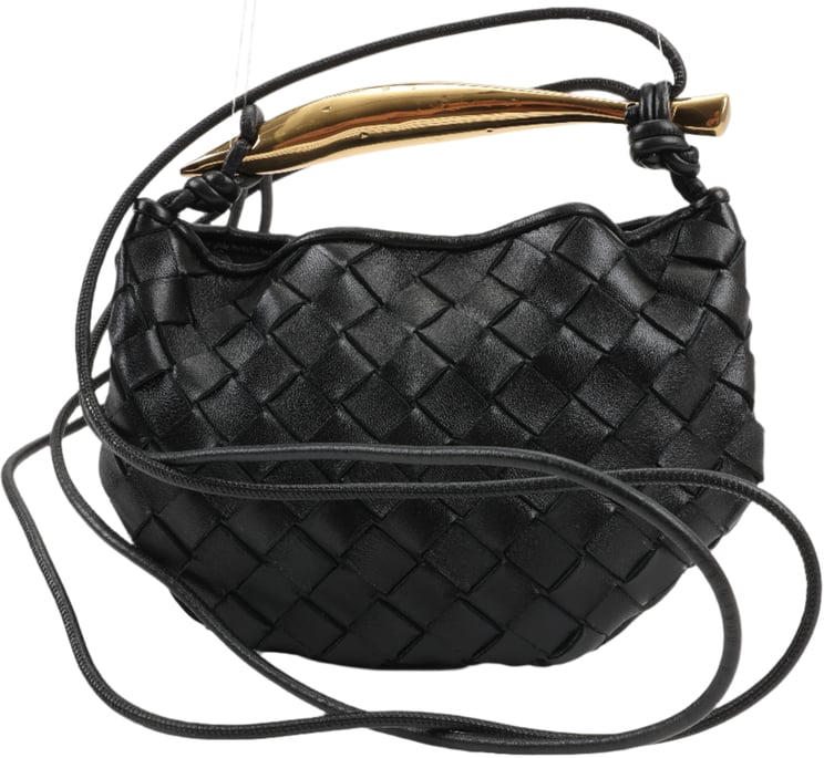 De Intrecciato Sardines schoudertas van Bottega Veneta combineert een sculpturale, gouden handgreep met het kenmerkende gevlochten leer voor een moderne, organische uitstraling. Het zwarte leer en de minimalistische lijnen benadrukken de luxe textuur, terwijl de lange verstelbare schouderriem veelzijdigheid in draagwijze biedt. Met een compacte silhouette van 11 x 14 cm en een bovenbreedte van 22 cm is de tas subtiel van formaat maar opvallend in ontwerp. Afgewerkt met goudkleurige hardware en een zwart interieur vormt dit model een verfijnde statement-piece.