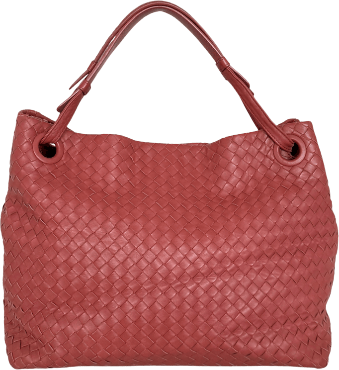 Zachte lila Nappa Intrecciato tote met gevlochten leren body en platte leren handvatten, uitgevoerd in een afgeronde mediumvorm met zwarte metalen ringen voor een subtiel contrast. Open bovenzijde met binnenvakjes waaronder een ritssluiting en steekvakken voor organisatie; afmetingen 27 x 32 x 13 cm. Gemaakt in Italië, geproduceerd tussen 2012 en 2025, en beoordeeld met conditiecode B+. Het verfijnde intrecciato-weefpatroon en de luxe nappa-afwerking benadrukken ambachtelijke kwaliteit.