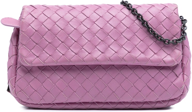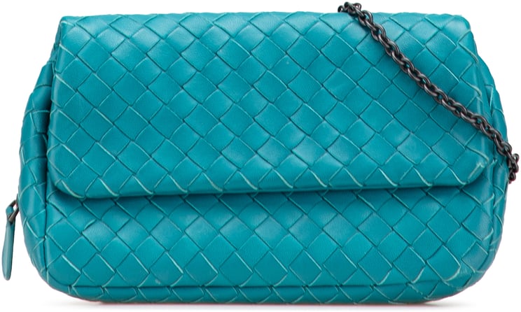 Een compacte, elegante crossbody uit de Mini Nappa Intrecciato-lijn met kenmerkende intrecciato-weving en een subtiele kettingband; de flap sluit met een drukknoop en een rits aan de onderzijde maakt uitbreiden van de basis mogelijk. De tas heeft een gestructureerde vorm met interieurvakken en een binnenvak met insteekvakjes, uitgevoerd in blauw en vervaardigd in Italië. Afmetingen: 18,5 x 11 x 6,0 cm, geschikt als schouder- of crossbodytas met moderne, verfijnde uitstraling. Het ontwerp combineert luxe textuur met praktische indeling voor dagelijks gebruik.