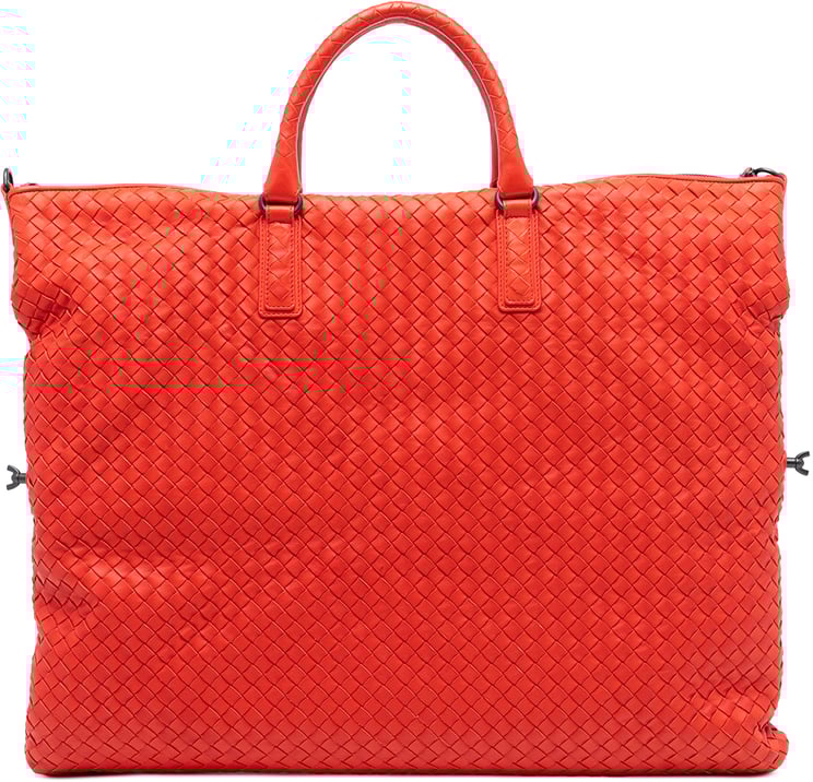 Een verfijnde Nappa Intrecciato Milano tote met de kenmerkende gevlochten leertechniek en een gestructureerde, ruime vorm die elegantie en functionaliteit combineert. De tas heeft opgerolde handvatten, een open bovenkant met een leren knoopsluiting en aan de binnenzijde een ritssluiting en insteekvak voor organisatie. Gemaakt in Italië en uitgevoerd in een opvallende rode kleur; afmetingen 34 x 22 x 20 cm. Het ontwerp toont subtiele stiksels langs de randen en een minimalistische afwerking die tijdloze veelzijdigheid biedt.