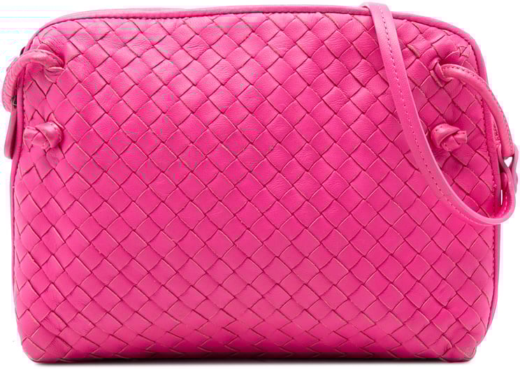 Een compacte, paars Nappa Intrecciato Nodini crossbody met kenmerkende intrecciato-weving en een strakke rechthoekige vorm, vervaardigd in Italië. De tas heeft een vlak leren verstelbare schouderband, een ritsopening aan de bovenzijde en binnen zowel een ritsvak als steekvak voor organisatie; afmetingen 24,00 x 16,00 x 5,00 cm. Fijne stiksels en een minimalistische sluiting benadrukken het vakmanschap van het ontwerp. Gefabriceerd in het productiejaar 2012-2025 en beoordeeld met conditieklasse B+.