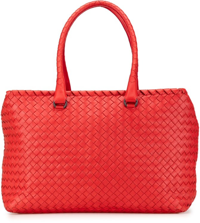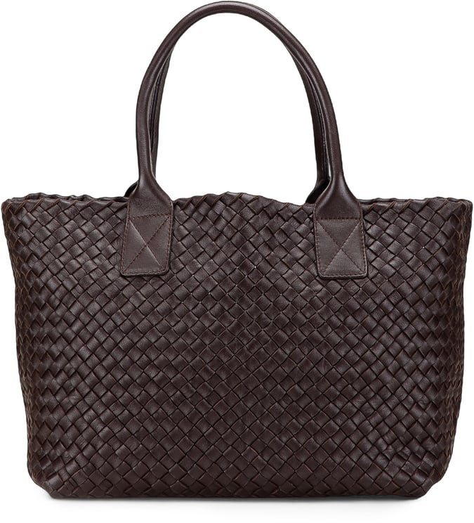 Deze Small Lambskin Intreccio Cabat tote combineert het kenmerkende gevlochten lammsherenleer met een open bovenkant en opgerolde handvatten voor een elegante draagervaring; de tas meet 15,00 x 31,50 x 23,50 cm en is gemaakt in Italië in 2008. Het warme bruine leer en het Intreccio-weefpatroon geven een tijdloze, luxe uitstraling, terwijl de meegeleverde pouch de functionaliteit vergroot. Afwerking en minimalistisch design benadrukken verfijning en textuur, geschikt voor dames die vakmanschap en subtiele details waarderen.