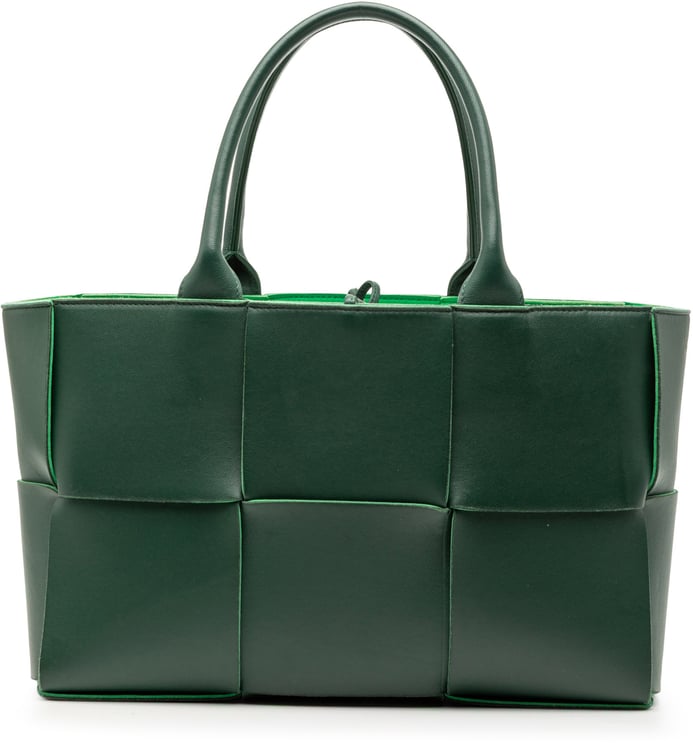 De Small Nappa Maxi Intrecciato Arco tote combineert een luxe intrecciato-nappa leren body met afgeronde, opgerolde leren handvatten en een open bovenkant met karakteristieke leren knoopsluiting; een bijgeleverde pouch vergroot de functionaliteit. Het verfijnde, lichtgroene leer en de geometrische vorm benadrukken het minimalistische, moderne ontwerp en laten de vakmanschaptextuur spreken. Compact van formaat met afmetingen 30 x 19 x 12 cm, geschikt voor dagelijks gebruik terwijl de constructie en afwerking een tijdloze uitstraling behouden. Het item is vervaardigd in Italië en dateert uit 2012–2025.