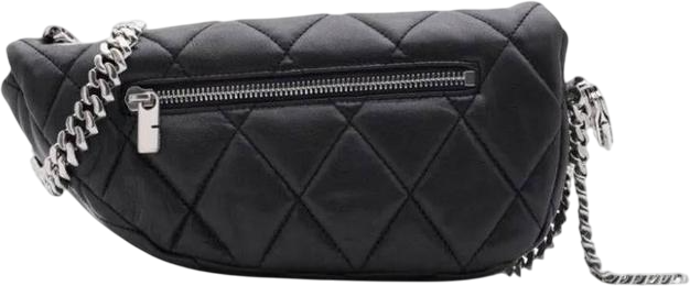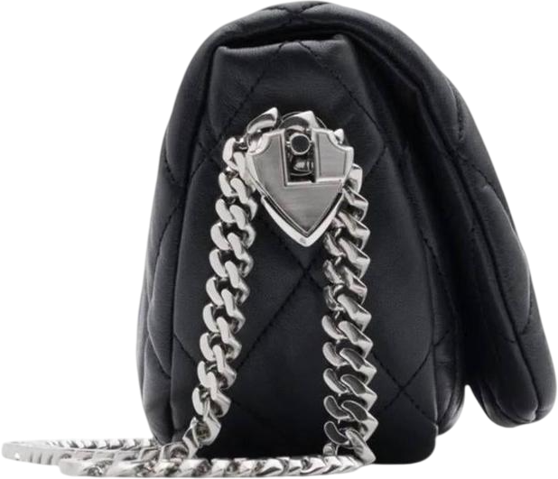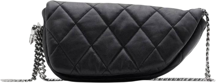 De Burberry schoudertas, 'Borsa a tracolla nera', heeft een elegant, gebogen ontwerp met een luxe, gewatteerde afwerking in diep zwart. Het diagonale stiksel creëert een opvallend ruitpatroon, wat zorgt voor diepte en textuur. De metalen kettingband voegt glamour toe en contrasteert mooi met de zachte lijnen van de tas. Unieke details zijn de subtiele logo-embossing en de strakke sluiting, die functionaliteit en stijl combineren. Deze tas is veelzijdig en geschikt voor zowel casual als formele gelegenheden.