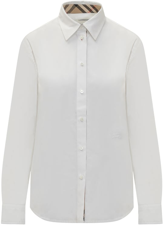 Dit Camicia Classica in Cotone overhemd toont een minimalistische, tijdloze esthetiek met een nette puntkraag en een subtiele knoopsluiting aan de voorkant. Het damesoverhemd in stralend wit heeft lange mouwen die eindigen in een strakke manchette, wat het geheel een professionele en elegante uitstraling geeft. Het minimalistische ontwerp wordt gecompleteerd door het discreet geborduurde Burberry-logo op de borst, dat een verfijnde luxe toevoegt. Dankzij de eenvoudige lijnen en hoogwaardige afwerking is dit overhemd geschikt voor zowel casual als formele gelegenheden.