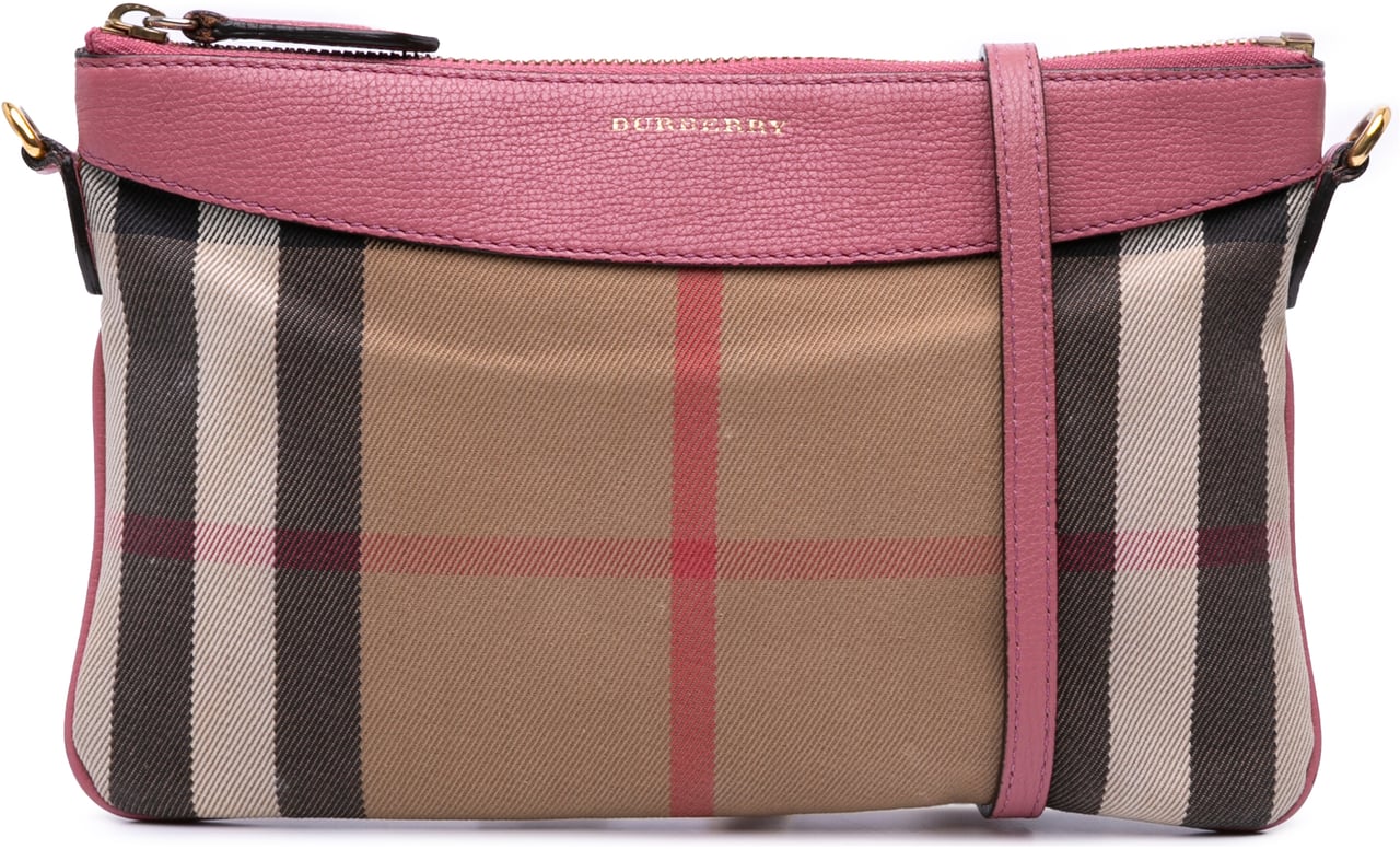 Een elegante crossbody uit de Peyton-lijn met House Check canvas en lederen details, uitgevoerd in bruin en met een afneembare, platte leren schouderband voor veelzijdig dragen. De tas sluit met een ritssluiting aan de bovenzijde en heeft interne steekvakjes voor organisatie; de afmetingen zijn 25 x 16 x 1 cm. Gemaakt in Roemenië tussen 2000 en 2017 en uitgevoerd met goudkleurig Burberry-logo op de bovenkant, gecombineerd met een opvallende fuchsia leren bovendetail voor contrast. Het ontwerp mengt het iconische ruitpatroon met verfijnde afwerking voor een herkenbare, luxe uitstraling.