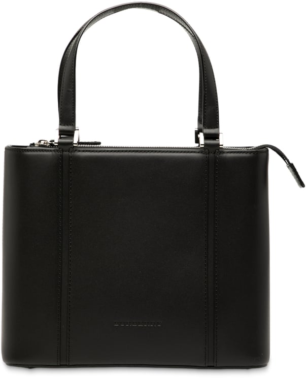 Deze Leather Handbag uit de Burberry-collectie combineert een gestructureerde, minimalistische vorm met een elegante zwarte kleur en subtiele metallic accenten voor een luxueuze uitstraling; het discrete logo aan de voorkant versterkt de verfijnde esthetiek. De tas heeft platte leren handvatten en een ritssluiting bovenaan, met binnen zowel een ritsvak als steekvakken voor organisatie. Materiaal: leer. Afmetingen: 26 x 21 x 10 cm. Land van herkomst: Verenigd Koninkrijk. Jaar van fabricage: 2000–2017.
