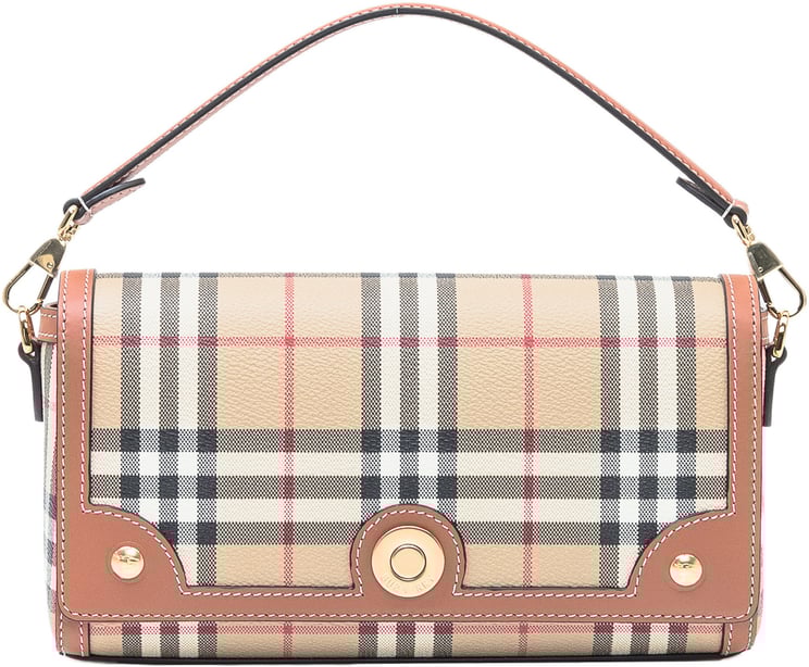 Een compacte schoudertas met gestructureerd ontwerp en frontale sluiting uit de Ll Sm Note Dfc Bag-lijn, uitgevoerd in het iconische Burberry-tartanpatroon met contrasterende dieprode leren rand. De opvallende ronde goudkleurige sluiting aan de voorkant geeft een elegant accent, terwijl de subtiele schouderband veelzijdig draagcomfort biedt. Het verwijderbare bovenhandvat voegt functionaliteit en variatie in draagwijze toe, terwijl nauwkeurige stiksels en afwerking het vakmanschap benadrukken. Afmetingen: 24 x 12 x 8 cm.