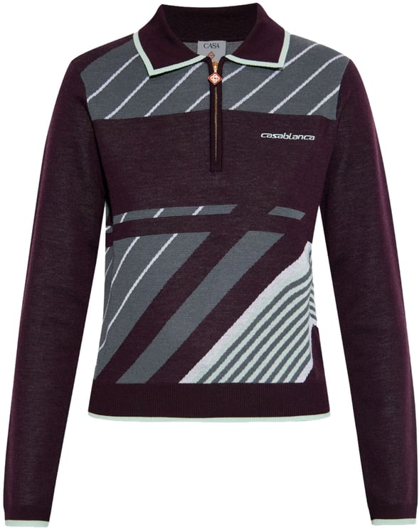 Een Casablanca Polo in Maglia con Zip met een geometrische fantasie in rijk bordeaux, grijs en wit die het ontwerp direct herkenbaar maakt. De contrasterende lichtgroene accenten langs kraag en onderrand geven een frisse touch, terwijl de contrastkraag het silhouet accentueert. De korte rits met opvallende gouden trekker fungeert als luxe sluiting en voegt een verfijnd detail toe. Het subtiel geplaatste Casablanca-logo op de borst benadrukt de merkidentiteit binnen het moderne, sportieve lijnenspel.