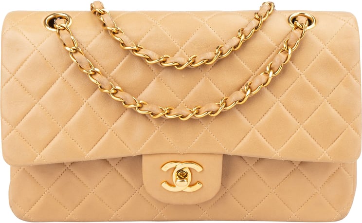 Een lichtbeige Quilted Lambskin Small Double Flap crossbody uit de Classic-lijn met geraffineerd gewatteerd patroon en het iconische CC-logo dat de luxe uitstraling onderstreept. De tas is uitgevoerd in lamsleder met 24K vergulde hardware en een opvallende gouden ketting die tussen circa 25 en 44 cm valt, waardoor hij als schouder- of crossbodytas te dragen is. Met compacte afmetingen van 22,5 x 14 x 6,5 cm biedt het model een strakke, verfijnde afwerking en tijdloze elegantie die zowel bij dagelijkse als meer formele looks past. Serienummer/datacode: 12969323 en geleverd met stofzak.