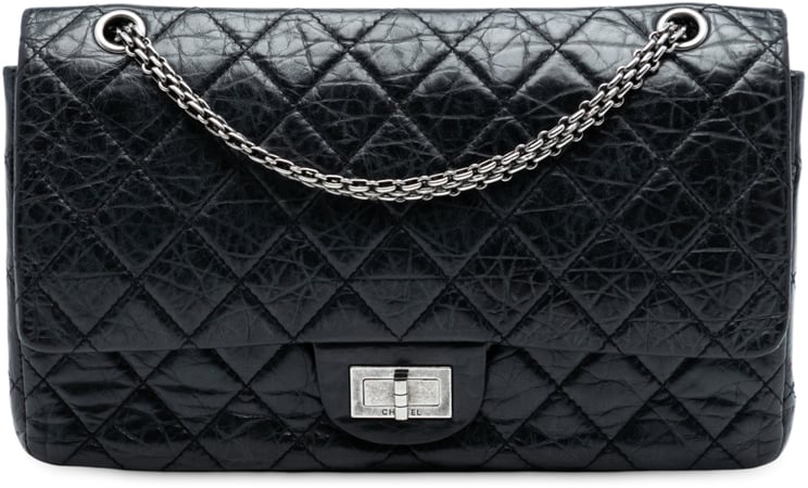 Deze Quilted Aged Calfskin Reissue 2.55 Double Flap 227 presenteert zich in diepzwart met het karakteristieke gewatteerde patroon en zilverkleurige kettinghandgreep voor een tijdloze, verfijnde uitstraling. De dubbele flap met draai-gespsluiting en een buitenvak aan de achterkant combineren klassieke Chanel-signatuur met praktische indeling; binnenin bevinden zich meerdere steekvakken voor organisatie. Gemaakt in Italië rond 2010–2011, uitgevoerd in aged kalfsleder en afgewerkt met metalen beslag in zilverkleur. Maat: 31,0 x 18,0 x 10,0 cm.
