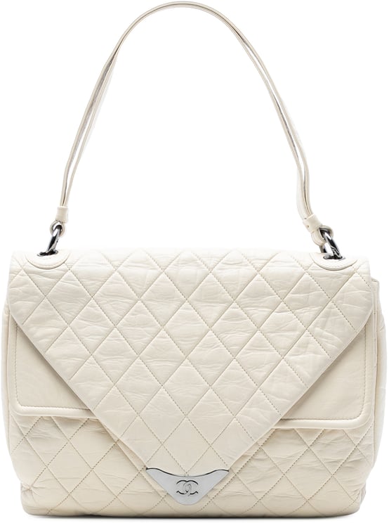 Een elegante Quilted Calfskin Expandable Zip Yacht Flap schoudertas met kenmerkend geruit doorgestikt ontwerp, een voorflap met magneetsluiting en een opbergbare basisrits voor extra inhoud. De tas heeft een opgerolde leren schouderband, een binnenvak met ritssluiting en een praktische, gestructureerde vorm; vervaardigd in Italië in 2009–2010. Hoofd materiaal: kalfsleer. Afmetingen: 29,00 x 22,00 x 12,00 cm. De witte kleur en subtiele details zoals de CC-geïnspireerde sluiting geven het model een tijdloze, luxueuze uitstraling.