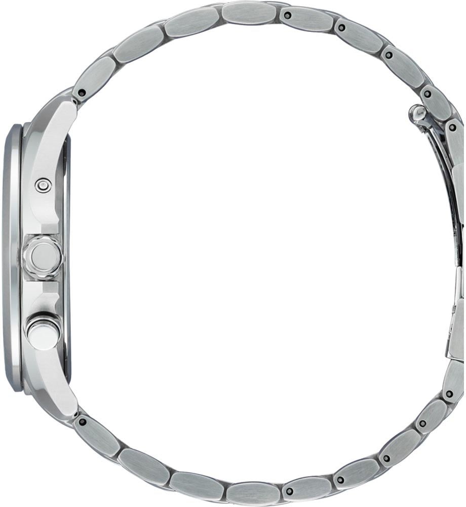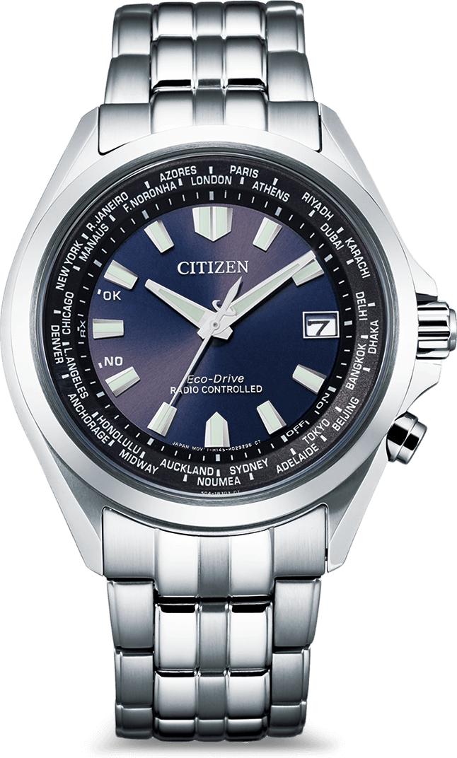 Het Citizen CB0220-85L is een radiogestuurd Eco-Drive horloge met een diameter van 42 mm, ontworpen voor heren. Dit model biedt een wereldtijdfunctie met een ring van steden rondom de wijzerplaat en een eeuwigdurende kalender die rekening houdt met schrikkeljaren. Het horloge haalt zijn energie uit zowel zonlicht als kunstlicht. De diepblauwe wijzerplaat contrasteert elegant met de zilveren kast en de heldere, luminescerende uur- en minutenwijzers. Een datumaanduiding op 3 uur versterkt de functionaliteit van dit moderne horloge.