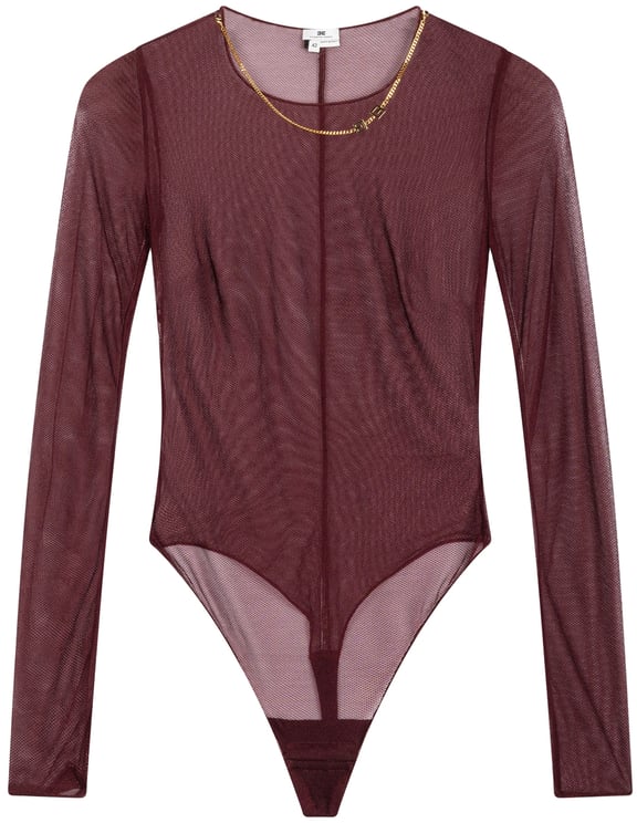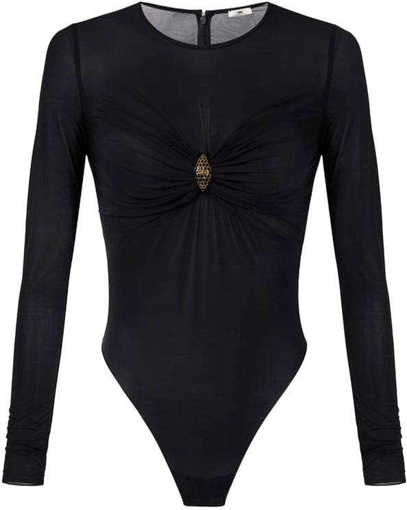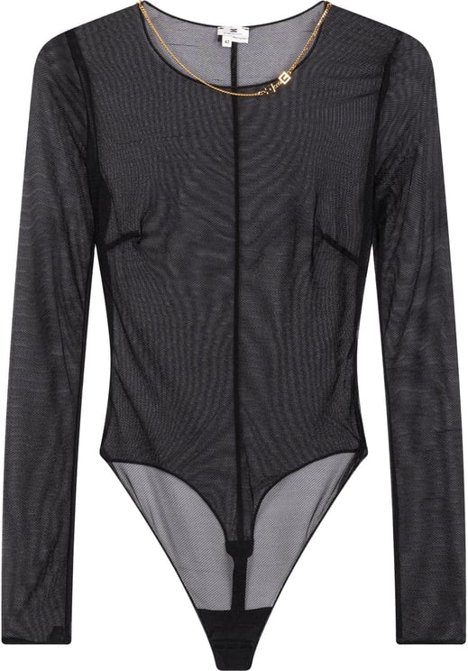Een elegante body van Elisabetta Franchi met lange mouwen en een ronde hals, uitgevoerd in zwart met semi-transparante mesh-structuur voor een moderne, gelaagde uitstraling. Het décolleté is subtiel verfraaid met een gouden kettingdetail dat een luxueus accent toevoegt aan het gestroomlijnde silhouet. De lijnen van het model blijven strak waardoor de mix van transparantie en bedekking verzorgd en opvallend overkomt. Dit veelzijdige ontwerp combineert verfijning en een gedurfde look, geschikt voor zowel avondjes uit als speciale gelegenheden.