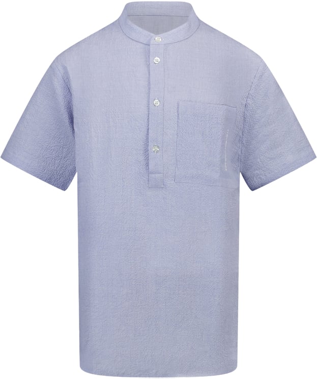 Deze blouse van Emporio Armani voor baby's in lichtblauw biedt een frisse uitstraling, ideaal voor de lente en zomer. Het ontwerp heeft een elegante, opstaande kraag en korte mouwen, perfect voor warmere dagen. De blouse is voorzien van een knoopsluiting met vier knopen en een subtiel geborduurd borstzakje met het logo van Emporio Armani, wat een luxe accent toevoegt. De textuur van de stof geeft een verfijnde uitstraling, waardoor deze blouse veelzijdig is voor zowel casual als iets formelere gelegenheden.