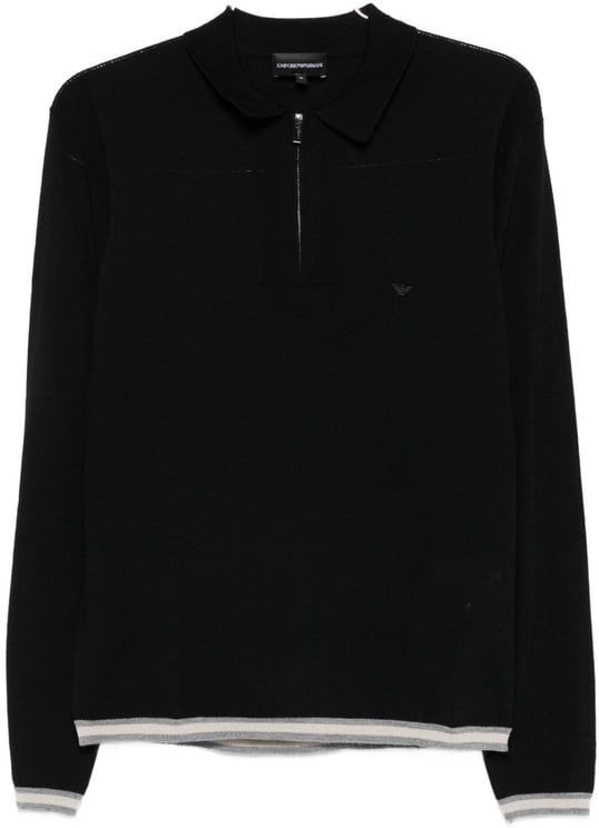 Een donkerblauwe herenpullover uit de Emporio Armani-lijn met een minimalistisch polo-ontwerp en een subtiel geborduurd logo-embleem op de borst. De kraag is uitgevoerd met een ritssluiting voor een moderne twist, terwijl de contrasterende streep aan de onderrand een sportieve flair toevoegt. Lange mouwen en een verfijnde textuur in de stof geven het stuk een chique doch casual uitstraling, geschikt voor diverse gelegenheden. Dit premium herenitem combineert ingetogen luxe met functionele details.