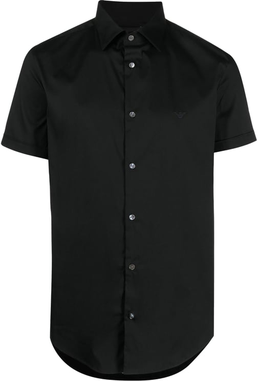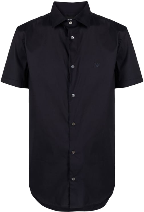 evening-blue stretch-cotton blend embroidered logo classic collar front button fastening short sleeves asymmetric hem