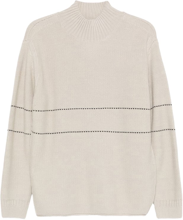 Deze sweater van Emporio Armani is ontworpen voor de herfst en winter en straalt elegantie uit met zijn verfijnde, neutrale kleur. Het ontwerp bevat subtiele ribbelstructuren rond de hoge kraag en horizontale lijnen in een contrasterende kleur die dynamiek toevoegen en de schouders en borst accentueren. De lange mouwen zijn afgewerkt met een gebreide rand voor een gestroomlijnde look. De combinatie van texturen en lijnen maakt deze sweater een stijlvol statement voor zowel casual als formele gelegenheden.