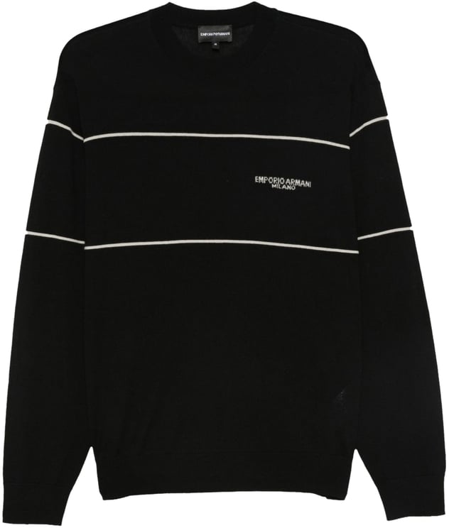 De Emporio Armani sweater voor heren is vervaardigd in een elegante, donkerblauwe kleur en voorzien van opvallende witte strepen die horizontaal over de borst lopen. Het subtiele, geborduurde logo aan de linkerkant voegt een luxe uitstraling toe. Met lange mouwen en een ronde halslijn biedt deze sweater een klassieke touch. Het minimalistische ontwerp en de strakke lijnen maken deze sweater veelzijdig en geschikt voor zowel casual als formele gelegenheden. Ideaal voor het herfst- en winterseizoen.
