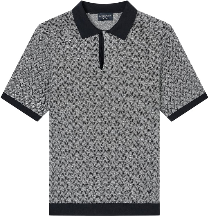 Dit Emporio Armani polo-shirt voor heren in blauw heeft een opvallend geometrisch zigzagpatroon in zwart en wit. De donkergekleurde kraag biedt een verfijnd contrast en de subtiele knoopsluiting voegt een moderne touch toe aan het klassieke ontwerp. De mouwen zijn afgewerkt met een contrasterende rand, wat bijdraagt aan de sportieve uitstraling. Dit shirt combineert tijdloze elegantie met een unieke textuur die een dynamisch effect creëert, waardoor het geschikt is voor zowel casual als meer formele gelegenheden.