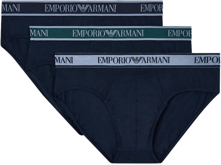 Drie Emporio Armani stretch katoenen briefs in diep marineblauw, uitgevoerd met een klassieke snit die een strakke, moderne look biedt. De tailleband is toon-op-toon van kleur en heeft een contrasterend Emporio Armani-logo, wat een luxe accent geeft en tegelijk een sportieve uitstraling door de stevige maar flexibele structuur. Gemaakt van stretch katoen voor draagcomfort en vormbehoud tijdens dagelijks gebruik. Deze set combineert functionaliteit met een ingetogen, elegante esthetiek in de herengarderobe.