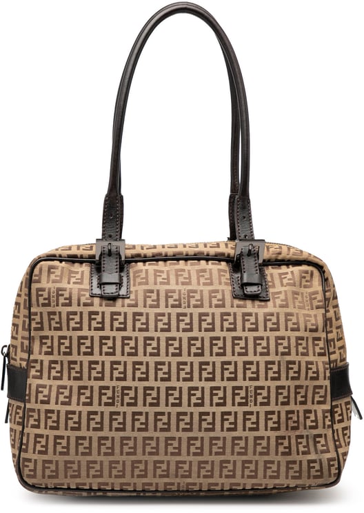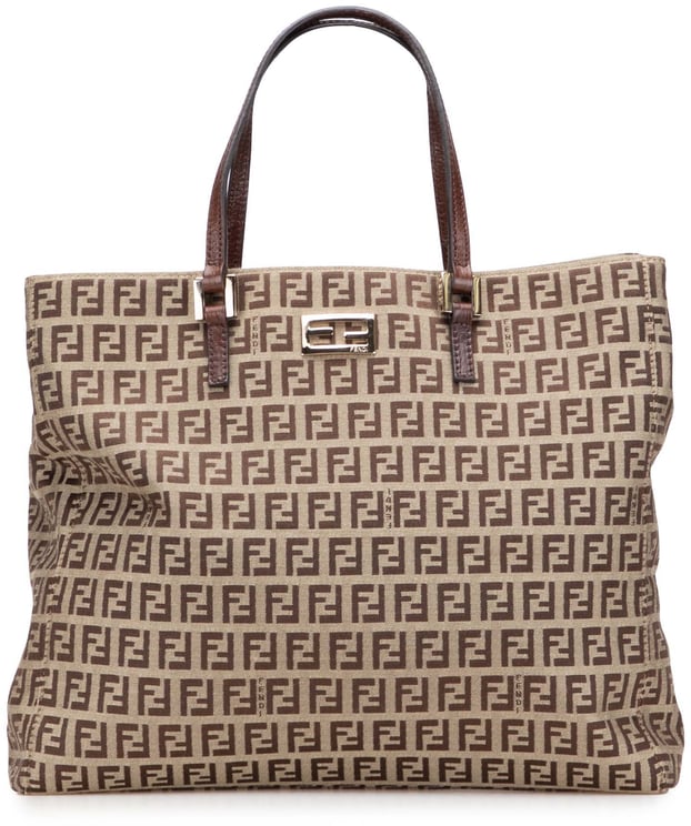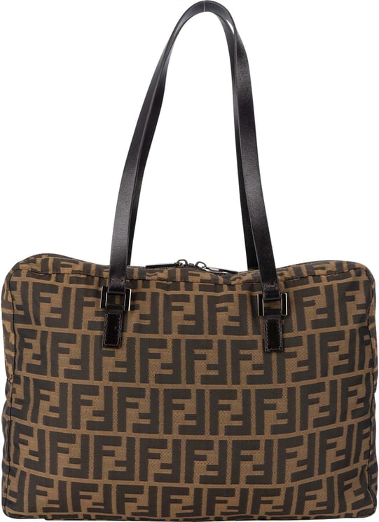 De Zucchino Nylon and Spalmati Grande Pillow Tote heeft een gestructureerde, opvallende vorm met het iconische monogram in verschillende tinten bruin en beige en subtiele contraststiksels die de luxe afwerking benadrukken. De tas is uitgevoerd in coated canvas en nylon en beschikt over lange platte handvatten, een open bovenkant met magneetsluiting en een binnenvak met ritssluiting voor extra organisatie. Afmetingen: 23 x 31 x 20 cm; gemaakt in Italië en vervaardigd tussen 2000 en 2010. Dit model combineert herkenbaar Fendi-ontwerp met praktische details zoals de binnenritszak.