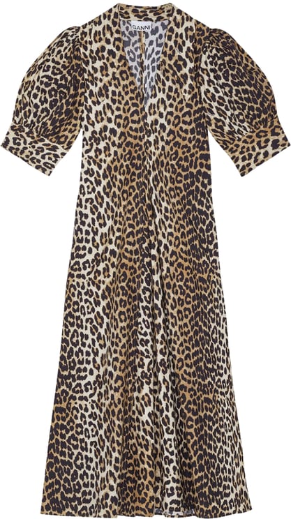 Deze jurk dierenprint uit de nieuwe collectie van Ganni valt op door een gedurfde luipaardprint in warme bruin- en beige tinten en een elegante V-halslijn. Korte mouwen en een unieke ruchesdetail aan de voorzijde geven het model een dynamische, opvallende uitstraling. De subtiel geaccentueerde taille creëert een flatterend silhouet, terwijl de soepel vallende, licht uitlopende rok beweging en flair toevoegt. Gemaakt van 100% cotton en ontworpen voor dames die een trendy, zelfverzekerde look willen.
