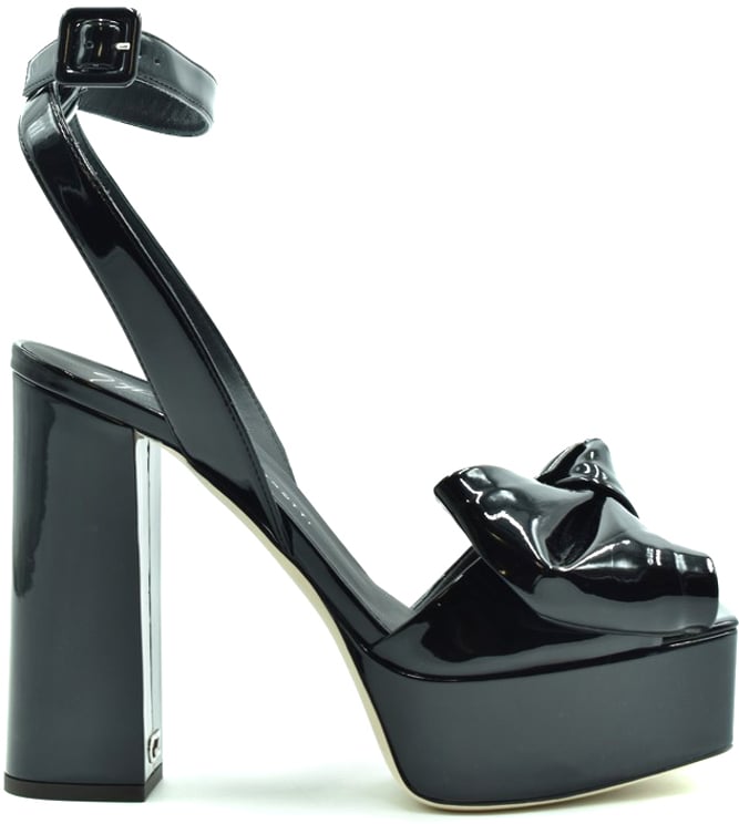 De Sandals Black van Giuseppe Zanotti zijn een elegant paar dames sandalen met een glanzende zwarte lakafwerking. Het ontwerp is voorzien van een opvallende, grote strik aan de voorkant, die een vrouwelijke touch biedt. De stevige blokhak zorgt voor hoogte en een gedurfde uitstraling, terwijl de enkelband met gespsluiting voor een verfijnde afwerking zorgt. De combinatie van de platformzool en de hak biedt een stijlvolle look, ideaal voor een avondje uit en het toevoegen van luxe en glamour aan elke outfit.