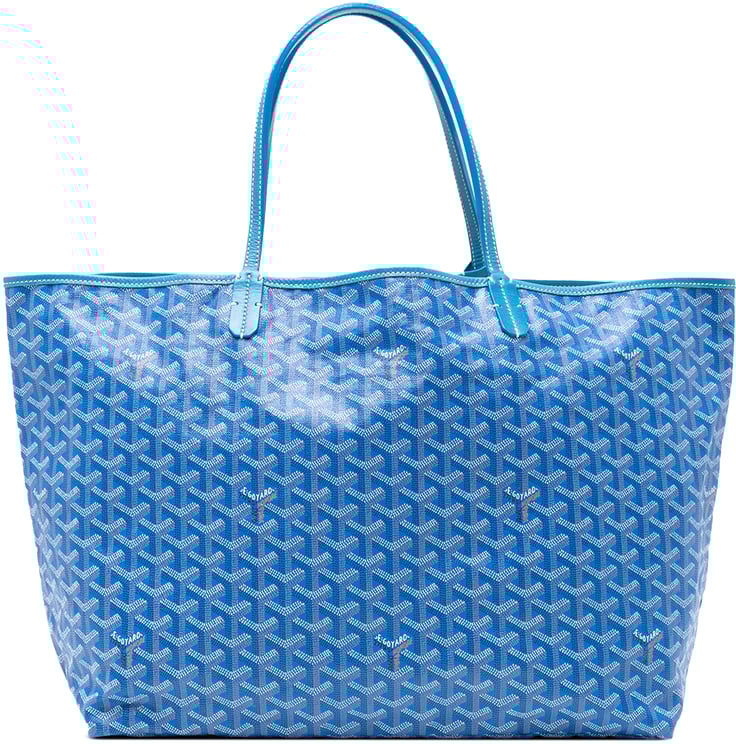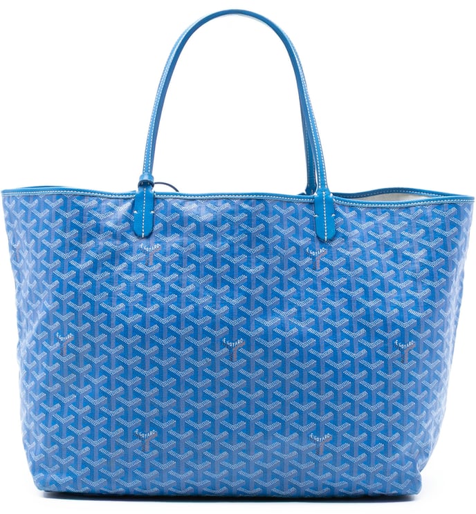 Een verfijnde Goyardine Saint Louis PM shopper met kenmerkend Goyard-patroon in blauw, uitgevoerd in gecoat canvas met lederen afwerking en platte leren handvatten. Het open bovenvak biedt directe toegang en wordt geleverd met een afneembaar flapvak voor extra organisatie; afmetingen 33,50 x 27,00 x 14,00 cm. Gemaakt in Frankrijk in 2016, de tas combineert een rechte, elegante vorm met diverse blauwtinten die diepte en subtiele contrasten toevoegen. De constructie en het iconische dessin benadrukken een luxueuze uitstraling voor de modebewuste vrouw.