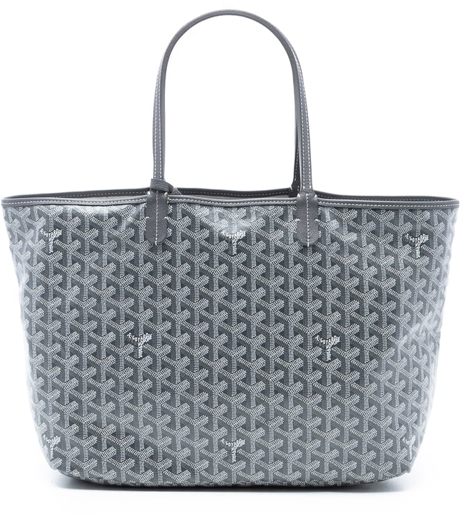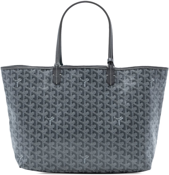 Een elegante Goyardine Saint Louis PM shopper met een verfijnde grijze coating en lederen afwerking, uitgevoerd in het iconische Goyard-patroon met subtiele Y-vormen en fijne stiksels die vakmanschap benadrukken. De tas heeft platte lederen hengsels, een open bovenzijde en een interieurvakje, en komt uit Frankrijk, vervaardigd in 2023. Afmetingen: 34,00 x 27,00 x 14,50 cm, een gestructureerde vorm met discrete logodetails die de exclusiviteit onderstrepen. Bij aankoop kan op verzoek een Certificaat van Authenticiteit worden verstrekt ter aanvulling op de interne en externe verificatie.