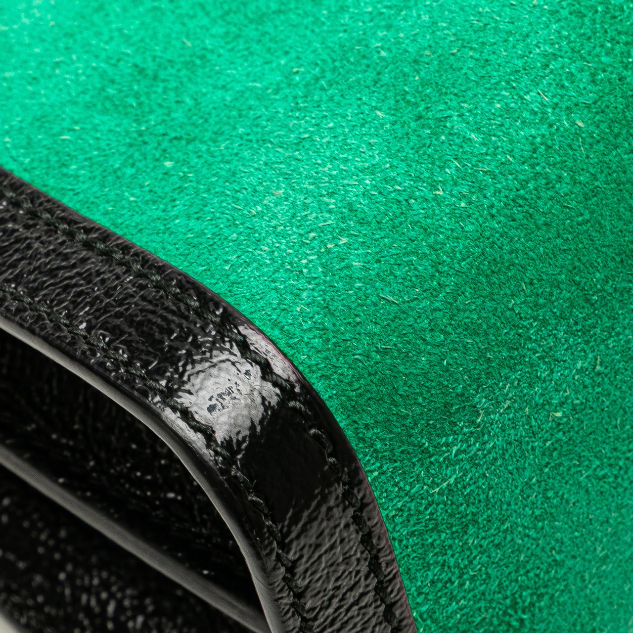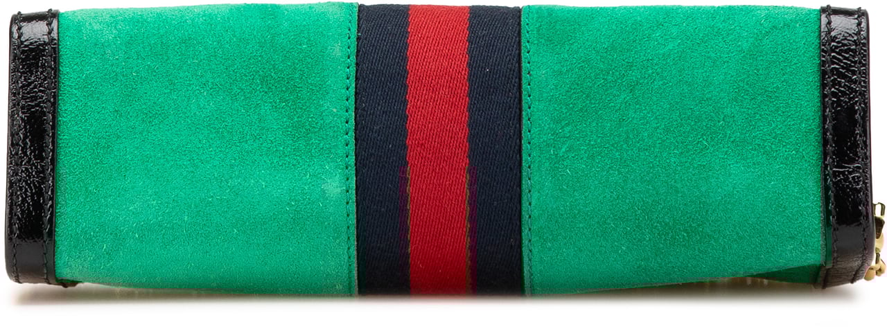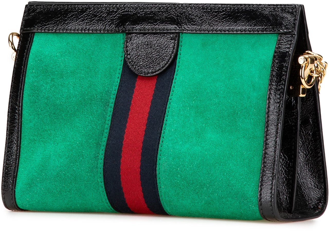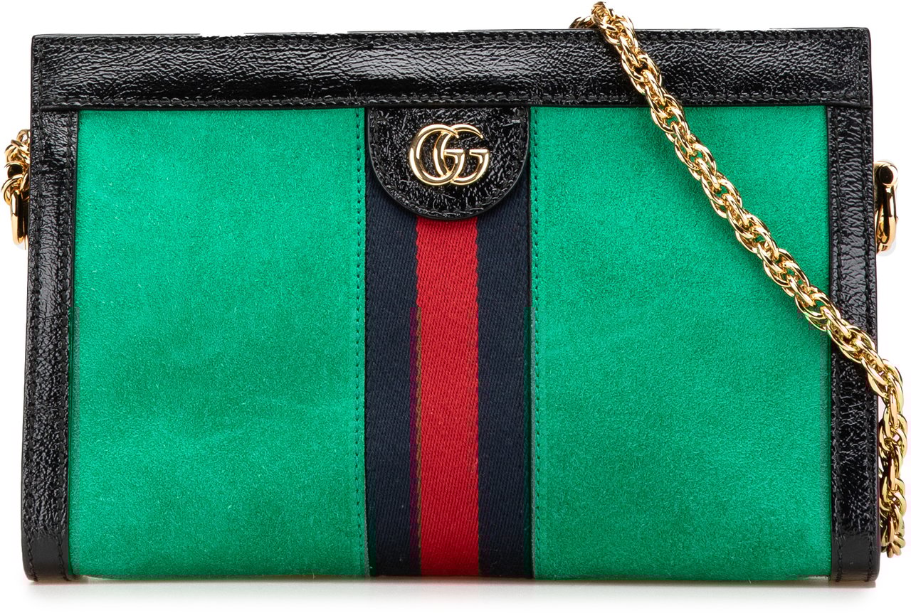 Een compacte green suède Small Suede Ophidia Chain Crossbody met zwart leren rand en de kenmerkende rood-blauwe streep, uitgevoerd met goudkleurig GG-embleem en een goudkleurige ketting schouderriem voor een chique uitstraling. De tas sluit met magnetische bovenkleppen en heeft binnenin een ritstasje en steekvakken voor organisatie; afmetingen 26,00 x 17,00 x 7,50 cm. Gemaakt in Italië en vervaardigd in de periode 2016–2024; materialen: suède met leren afwerking.