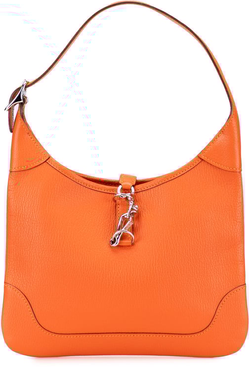 Deze Clemence Trim II 38 combineert een zachte Clemence-leer constructie met een organische, afgeronde bovenkant en een brede, platte schouderband voor comfortabel dragen. Het ontwerp heeft een topriem met een lobstersluiting en een ritssluiting bovenop, met binnenzakken zowel met ritssluiting als steekvak voor organisatie; contrasterende randen en zorgvuldig stiksels accentueren de verfijnde lijnen. Afmetingen: 34 x 25 x 7 cm. Gemaakt in Frankrijk in 2001, uitgevoerd in bruin en voorzien van een opvallend metalen sluitdetail dat een luxe uitstraling geeft.