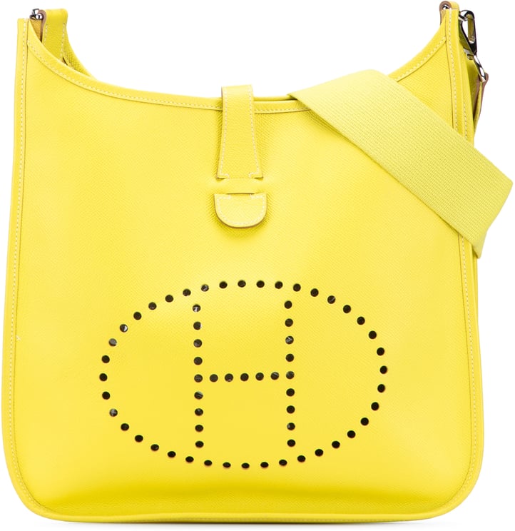 Een opvallende gele Evelyne GM crossbody met afgeronde vorm en minimalistische uitstraling, uitgevoerd in Courchevel kalfsleder met goudkleurige hardware. Het kenmerkende perforatie‑'H' geeft een moderne en toch verfijnde toets, terwijl de brede schouderband comfort en een casual chic uitstraling biedt. Afmetingen 32 x 29 x 8,5 cm maken de tas ruim genoeg voor dagelijkse essentials en het ontwerp blijft herkenbaar en tijdloos. De tas wordt geleverd met schouderriem en stofzak en draagt de datacode A in een vierkant (1997).