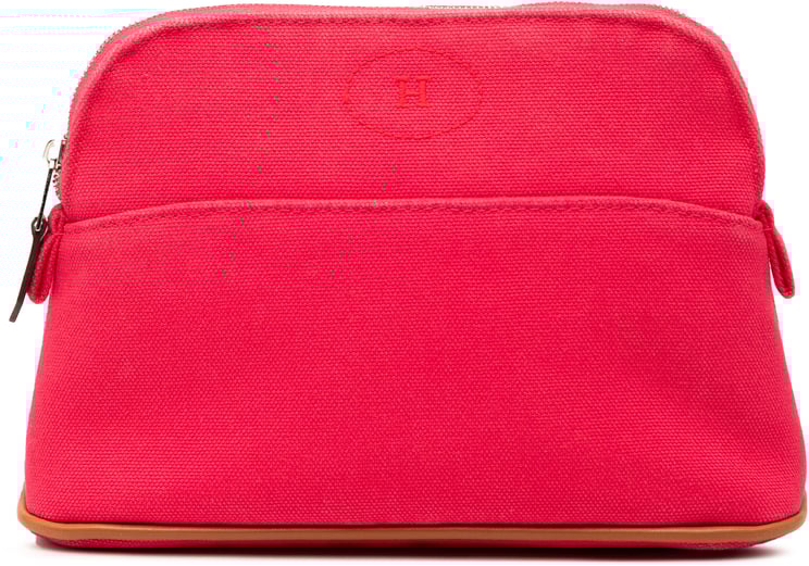Compacte Mini Toile Bolide Case met een canvas body en leren biezen, uitgevoerd in opvallend oranje en met een rits aan de bovenzijde voor veilige sluiting. Het minimalistische, afgeronde ontwerp en de discrete Hermès-markering geven de toilettas een moderne, elegante uitstraling; afmetingen 15,50 x 10,50 x 6,00 cm. Gemaakt in Frankrijk en voorzien van een zorgvuldig afgewerkte rits. Dit model combineert praktische functionaliteit met een heldere, luxueuze esthetiek.