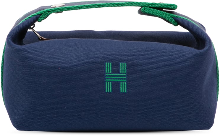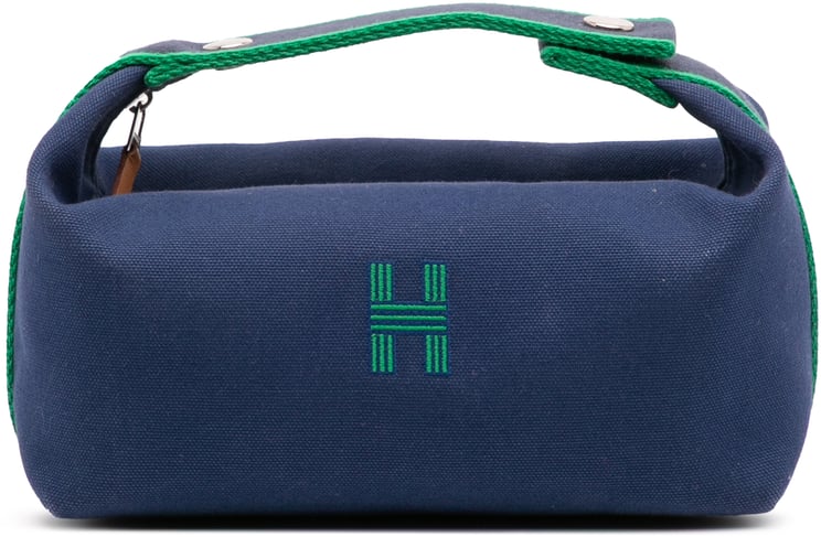 Een compacte, eigentijdse Small Canvas Bride A Brac in diepblauw met groene accenten, uitgevoerd in canvas en ontworpen met een strakke, geometrische vorm en een opvallende geborduurde H aan de voorkant; het model heeft een plat handvat met gevlochten textuur, een ritssluiting aan de bovenzijde en interne steekvakken voor organisatie. De afmetingen zijn 24 x 12 x 15 cm, het item is vervaardigd in Frankrijk en dateert uit 2020–2025, waardoor het een verfijnde, veelzijdige tas is die zowel casual als formeler gedragen kan worden. Het ontwerp benadrukt minimalistische elegantie met zorgvuldig uitgewerkte details.
