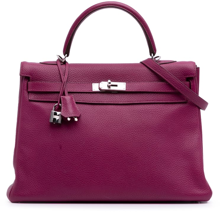 Een elegante Birkin Retourne 30 in Togo-leer in Rouge Pivoine met een gestructureerde, tijdloze vorm en gerolde leren handvatten; de herkenbare flap met metalen draaisluiting en zorgvuldig geplaatste hardware geven de tas een luxueuze uitstraling. De binnenzijde is uitgerust met een ritspocket en steekvakken voor organisatie, en de subtiele stiksels benadrukken de ambachtelijke afwerking. Afmetingen: 30 x 22 x 15 cm. Gemaakt in Frankrijk in 2014; conditebeoordeling B+ en er is een certificaat van echtheid op verzoek.