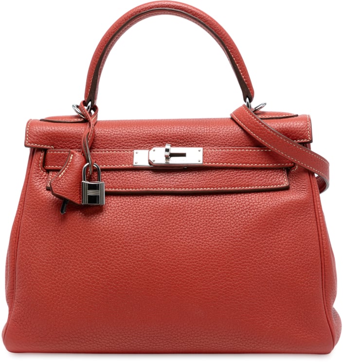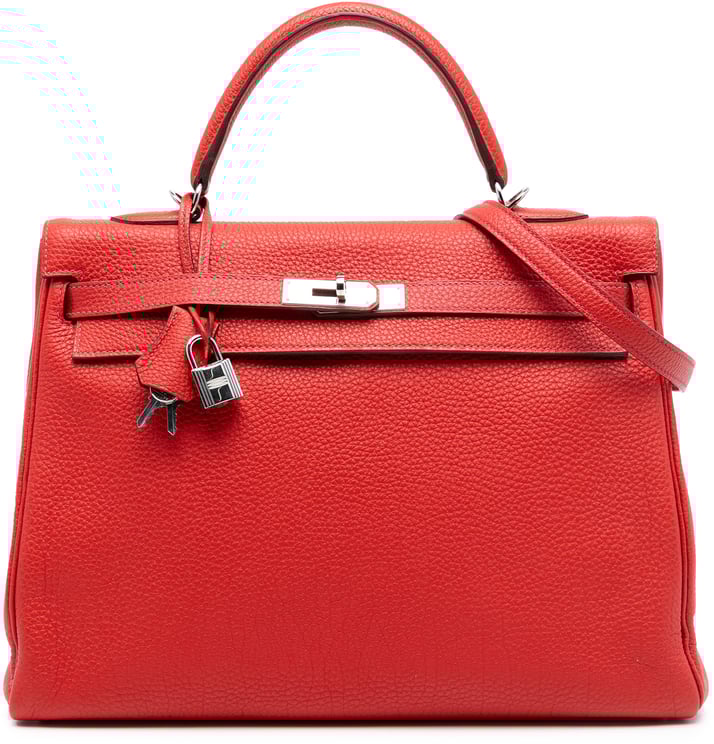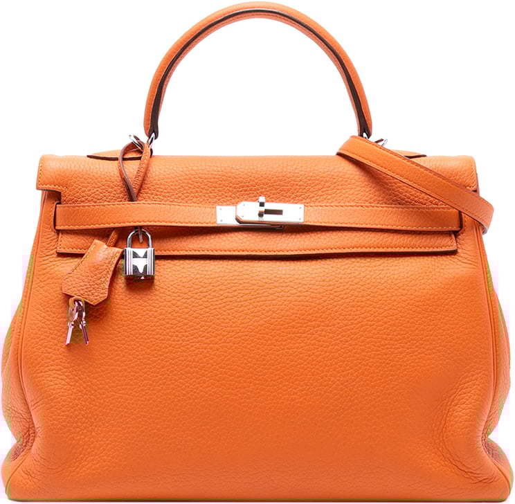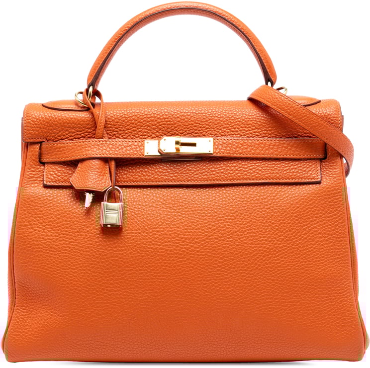 Een elegante Togo Kelly II Retourne 35 in levendig oranje, uitgevoerd in Togo-leer met een topflap en draaivergrendeling afgewerkt in zilverkleurig metaal. Het ontwerp heeft een plat leren bovenhandvat en een afneembare platte schouderriem, met binnenin een ritssluiting en steekvakken voor organisatie. De tas is gestructureerd van vorm en meet 35,00 x 23,50 x 13,00 cm, vervaardigd in Frankrijk in 2014, en draagt herkenbare Hermès-details zoals het leren sleutelhangerhangertje en signature sluiting. De subtiele textuur en krachtige kleur geven dit model een tijdloze, luxueuze uitstraling.