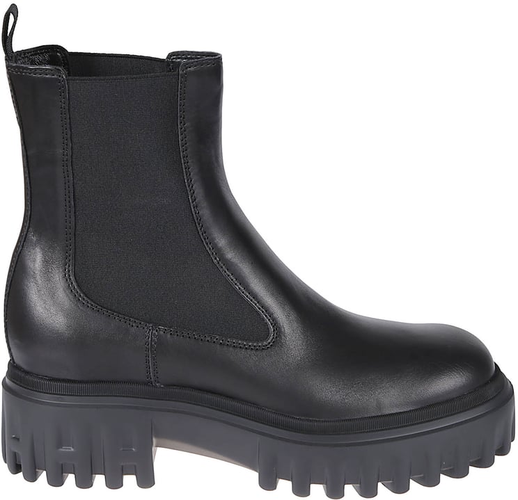 Deze Boots Black uit de HOGAN-collectie combineert een hoge schacht met een ronde neus en een opvallende, verhoogde rubberen zool van 7,6 cm voor een moderne twist op de klassieke combatboot. De laars sluit met veters en metalen oogjes aan de voorkant en heeft een extra ritssluiting aan de zijkant voor gemakkelijke toegang. Een logo op de tong en een logo-patch op de zijkant geven herkenbare merkaccenten zonder te overheersen. Volledig zwart uitgevoerd met lederen materiaal, ideaal voor eigentijdse, sterke looks.