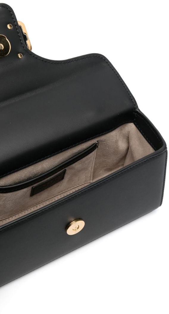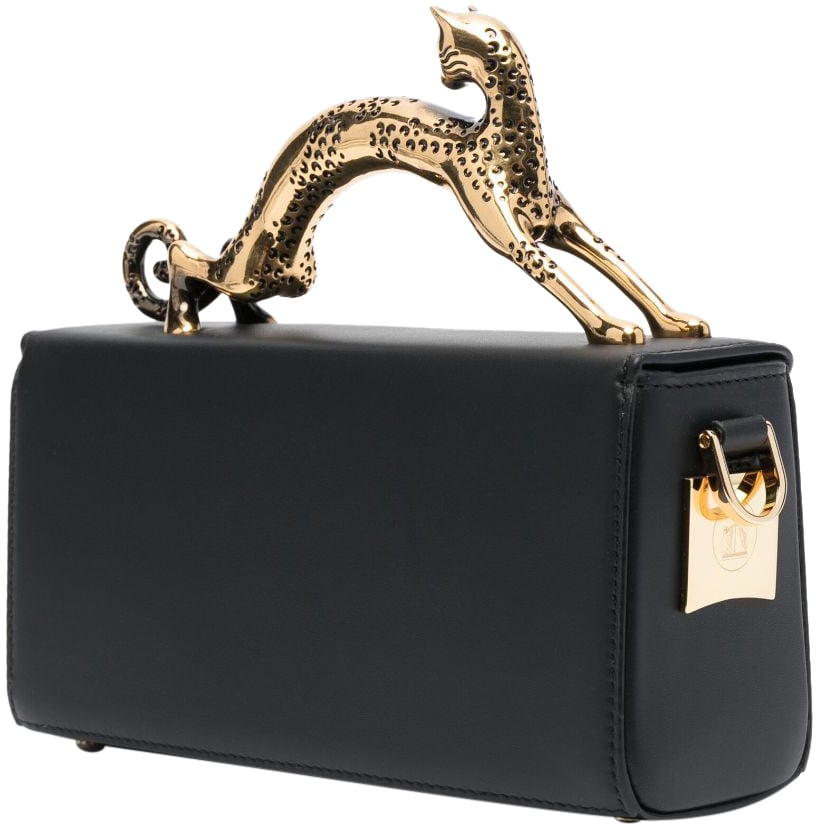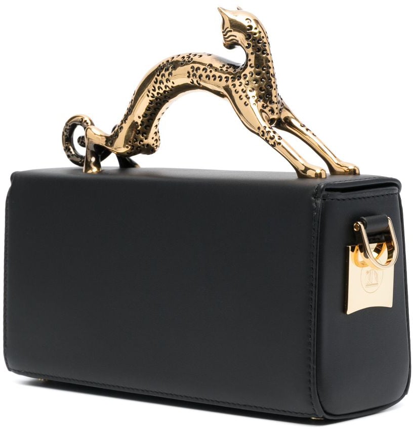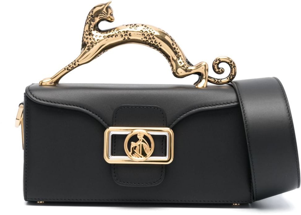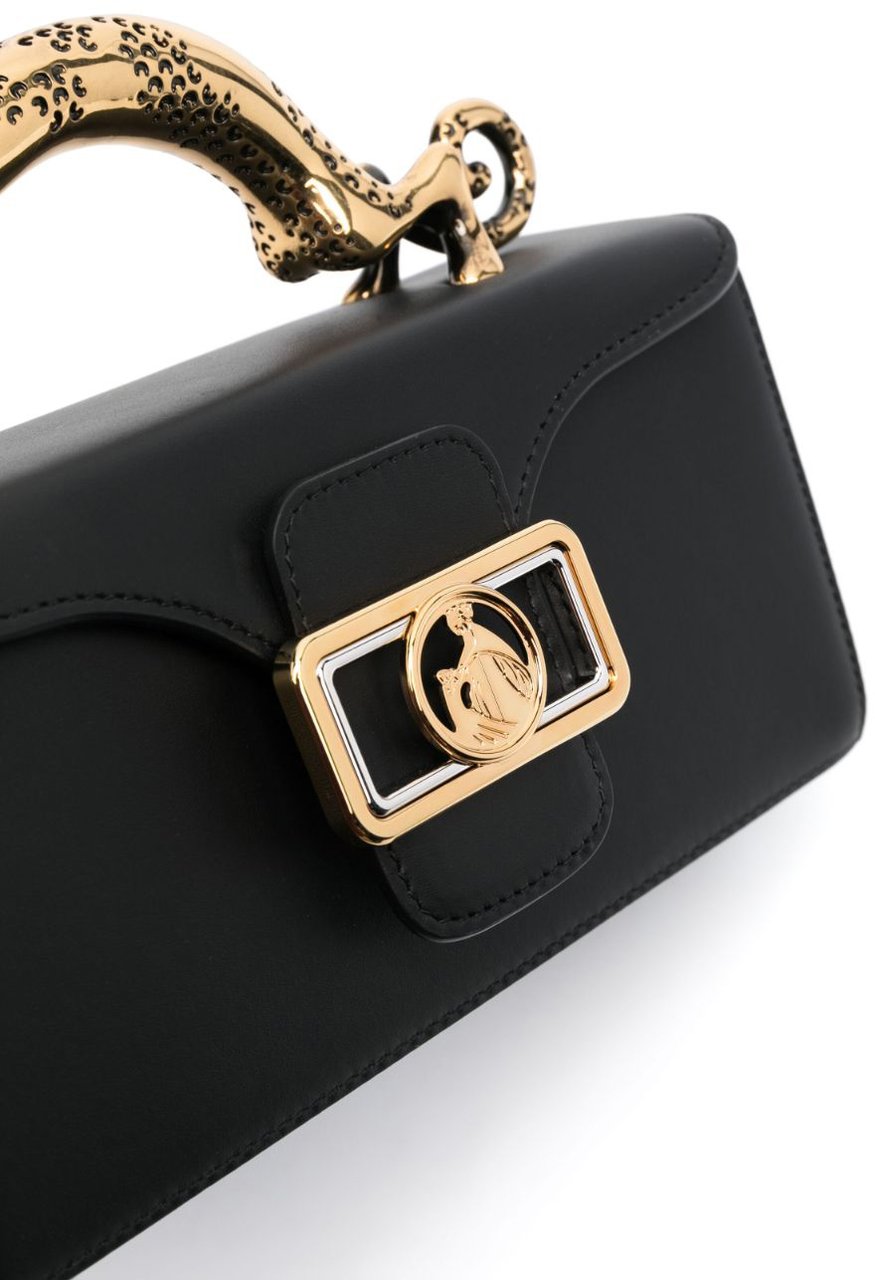 De Bags Black van Lanvin is een elegante tas die opvalt door zijn unieke ontwerp. Gemaakt van hoogwaardige materialen, heeft de tas een diepe zwarte kleur voor een tijdloze uitstraling. Het meest kenmerkende detail is de gouden handgreep in de vorm van een sierlijke panter, die een luxe touch toevoegt. De sluiting is voorzien van een opvallende gouden gesp, wat een chique accent biedt. De strakke lijnen van de tas worden mooi in balans gebracht door de organische vormen van de panter, waardoor dit een statement stuk is voor elke gelegenheid.