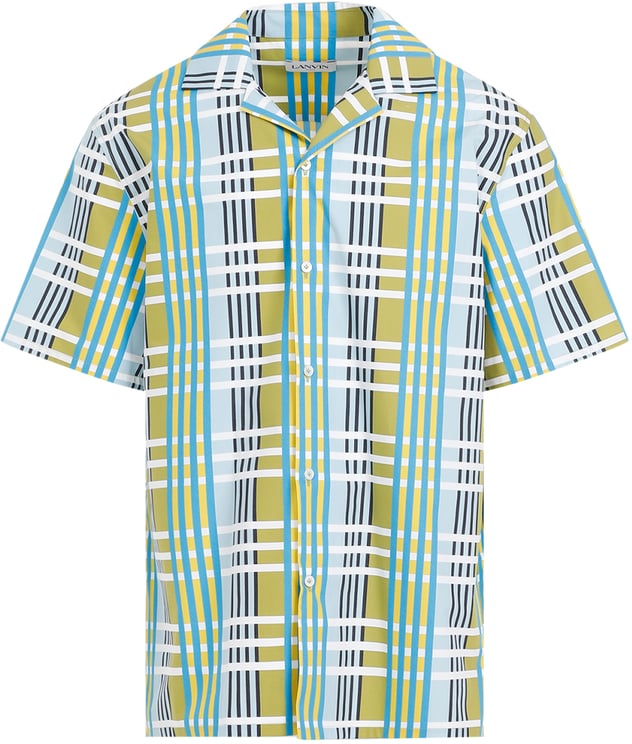 Het Budgie overhemd van Lanvin is een casual herenoverhemd met een opvallend ruitpatroon in heldere kleuren zoals blauw, geel en zwart. Het ontwerp bevat lijnen van verschillende diktes, wat zorgt voor diepte en dynamiek. De brede, open kraag en korte mouwen maken het overhemd geschikt voor warmere dagen. De knopen zijn subtiel geïntegreerd, waardoor de nadruk op het unieke ruitmotief blijft liggen. Dit overhemd weerspiegelt een moderne stijl en creativiteit, ideaal voor de lente en zomer.