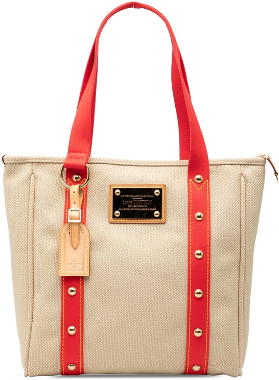 De Antigua Cabas PM combineert een canvas body met platte handvatten, een ritssluiting bovenaan en een binnenvak als praktische indeling, uitgevoerd in bruin met contrasterende oranje accenten en een goudkleurig merkplaatje voor een luxueuze uitstraling. Het ontwerp toont metalen studs en een leren label met logo en heeft een compacte maat van 20 x 22 x 6 cm, ideaal voor dagelijks gebruik met duidelijke aandacht voor afwerking en details. Gemaakt in Frankrijk in 2005, heeft de tas een stevige constructie met duidelijke decoratieve elementen en een moderne, statementgerichte esthetiek.