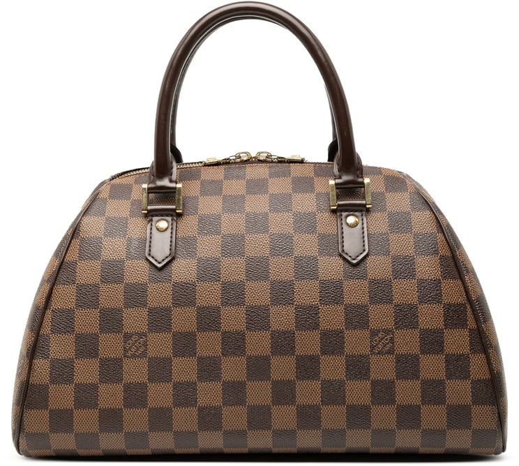 De Trevi PM uit de Damier Ebene-collectie combineert het kenmerkende damier ebene canvas met leren afwerking en afgeronde, opgerolde handvatten. De tas sluit met een ritssluiting en heeft van binnen meerdere slipzakken voor organisatie; de afmetingen zijn 33 x 26 x 11 cm. Gouden hardware contrasteert met het bruine dessin en het ontwerp toont een subtiele plooistructuur aan de voorkant voor een geraffineerde uitstraling. Gemaakt in Frankrijk in 2009 en beoordeeld met conditie B+.