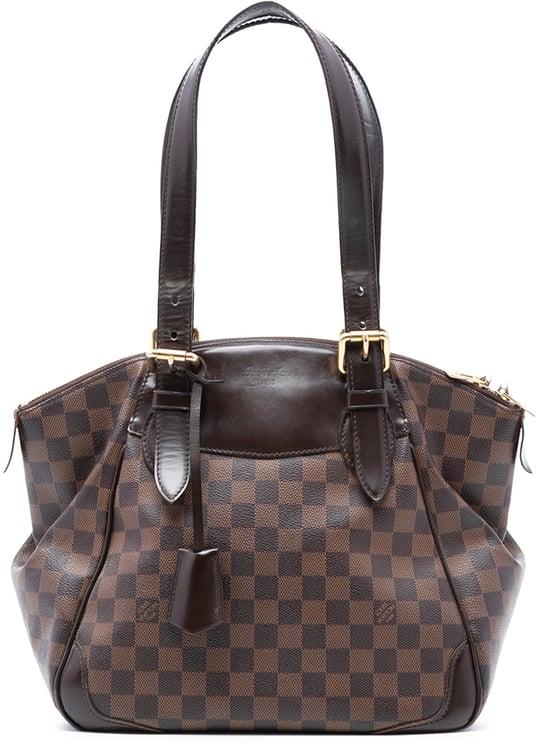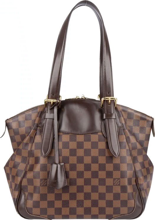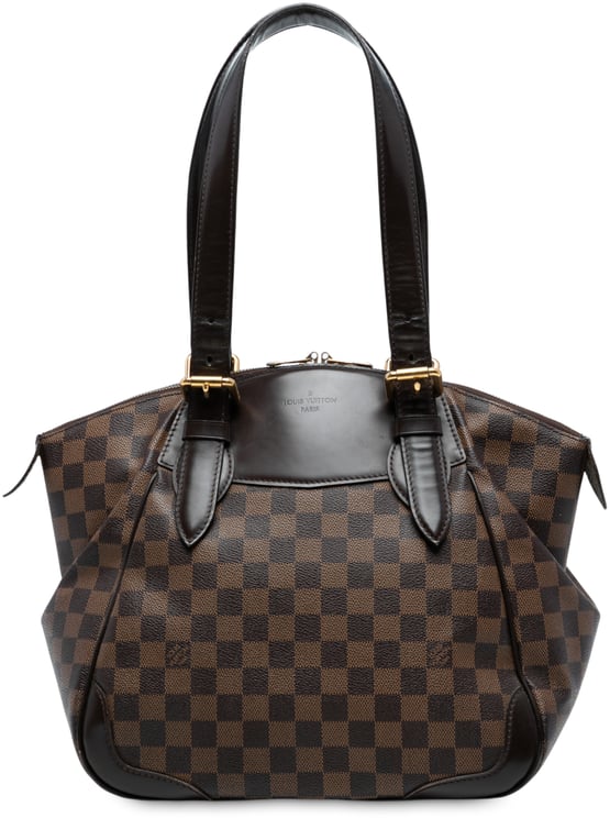 De Verona MM uit de Damier Ebene-collectie combineert het kenmerkende ruitpatroon van bruin canvas met leren accenten en platte lederen draagbanden voor een geraffineerde uitstraling. Het model sluit met een dubbele ritssluiting en heeft binnenin handige steekvakken die ordening vergemakkelijken; afmetingen: 29,50 x 29,00 x 17,50 cm. Gefabriceerd in Frankrijk in 2010, met oog voor vakmanschap en afgewerkt met metalen details en een hangslotaccent. De constructie en leren trim benadrukken zowel stijl als dagelijkse functionaliteit.