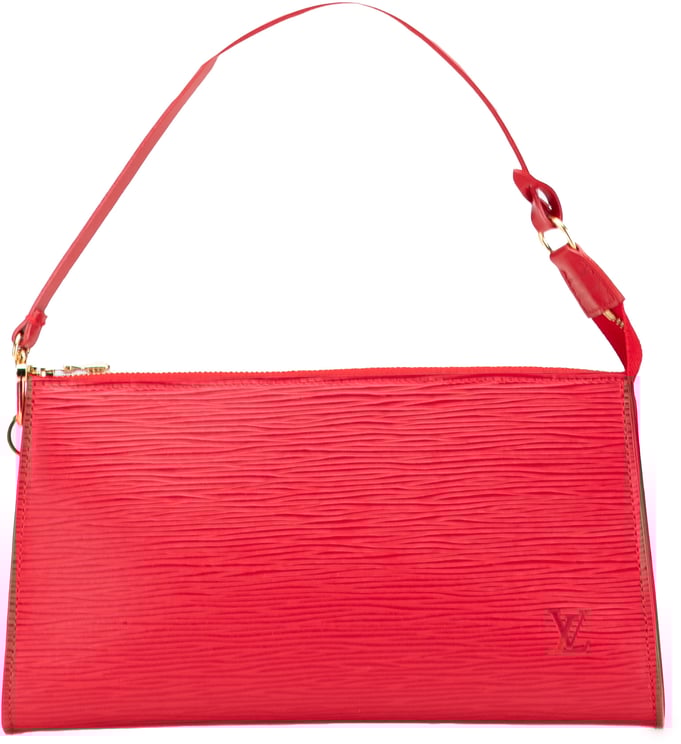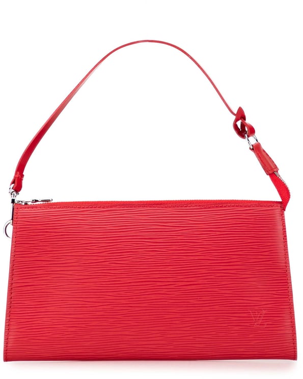 De Epi Pochette Accessoires presenteert zich in een opvallende rode kleur met een gestrekte, langwerpige vorm uitgevoerd in Epi-leer, afgewerkt met een platte leren schouderriem en een ritssluiting aan de bovenkant. Het minimalistische ontwerp toont een subtiele textuur en discreet geplaatst LV-logo, waardoor de tas een verfijnde en luxueuze uitstraling behoudt. Met compacte afmetingen van 21,5 x 11,5 x 2,0 cm biedt dit model praktische opbergruimte terwijl het slanke silhouet elegant blijft. Het exemplaar is vervaardigd in Frankrijk en dateert uit 2000, beoordeeld in conditieklasse AB.