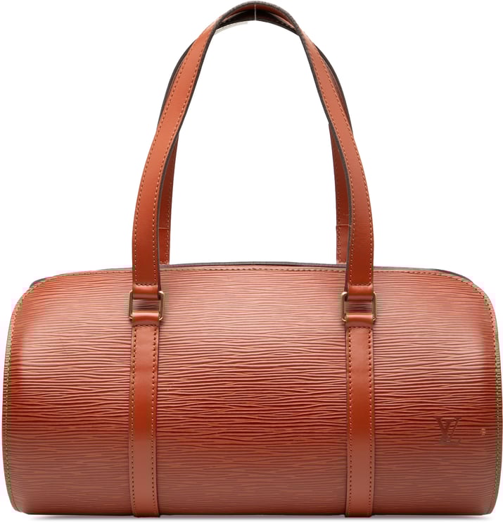 Een elegante Epi Soufflot handtas uit 1997 in dieprood, uitgevoerd in epi-leer met platte leren handvatten, een ritssluiting aan de bovenzijde en een binnenvak als insteek. Het cilindrische silhouet en de karakteristieke textuur van het leer geven een luxueuze, tijdloze uitstraling, afgewerkt met subtiele stiksels en iconische Louis Vuitton-accenten. Afmetingen: 31 x 15 x 14 cm, vervaardigd in Frankrijk; de constructie bevat een praktische bevestiging binnenin en een functionele binneninsteekzak. Dit model combineert draagcomfort met een opvallend, chique ontwerp.