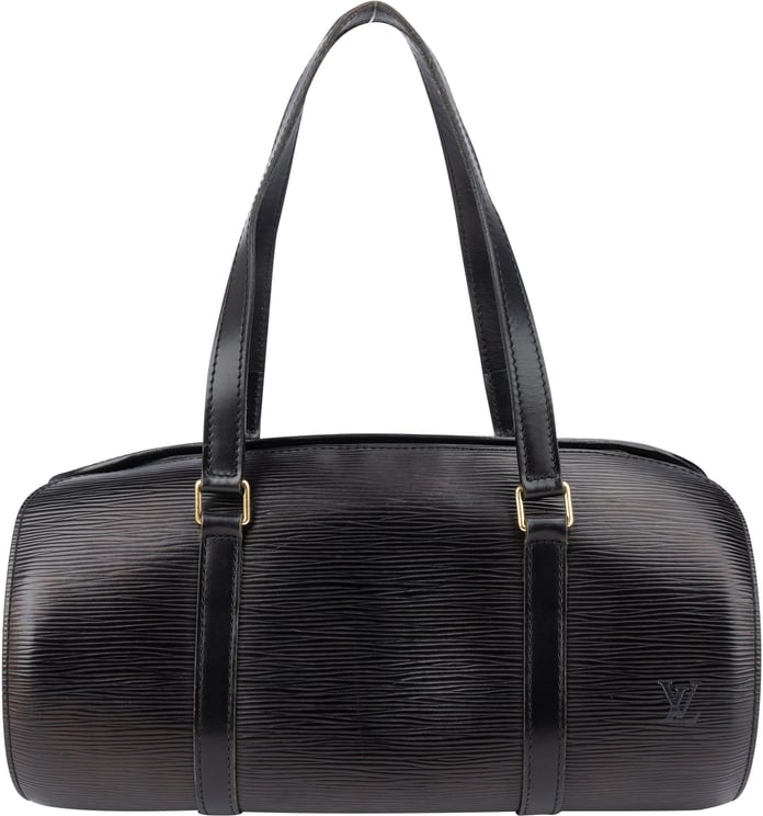 Een compacte, cilindrische handtas uit de Epi Soufflot-lijn met het kenmerkende verticale Epi-leer dat subtiele textuur en een tijdloze zwarte uitstraling biedt. De tas heeft platte leren hengsels, een ritssluiting aan de bovenzijde en een binnenvak als praktische indeling; afmetingen 30,5 x 15 x 14 cm. Gouden hardware en een discreet LV-logo geven verfijnde accenten terwijl het geheel een gestroomlijnde silhouet behoudt. Gemaakt in Frankrijk in 1996, de tas draagt een B+-conditie met genoemde gebruikssporen aan handvat, bovenrand, buitenzijde en voering.