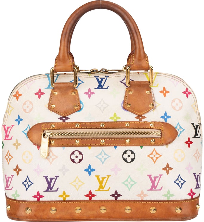 De Murakami Multicolor Alma PM presenteert zich in wit canvas met het iconische monogram in levendige kleuren en een afgeronde, klassieke Alma‑vorm. De tas heeft stevige handvatten van vachetta leer en een ritssluiting aan de voorzijde met een gouden trekker, terwijl gouden studs de onderkant accentueren voor extra detail. Gemaakt van canvas en vachetta leer, met afmetingen 32 x 28 x 16 cm en geleverd met stofzak; serienummer FL0074 is aanwezig. Het contrast tussen het kleurrijke dessin en bruine leren accenten geeft de tas een uitgesproken, luxueuze uitstraling.